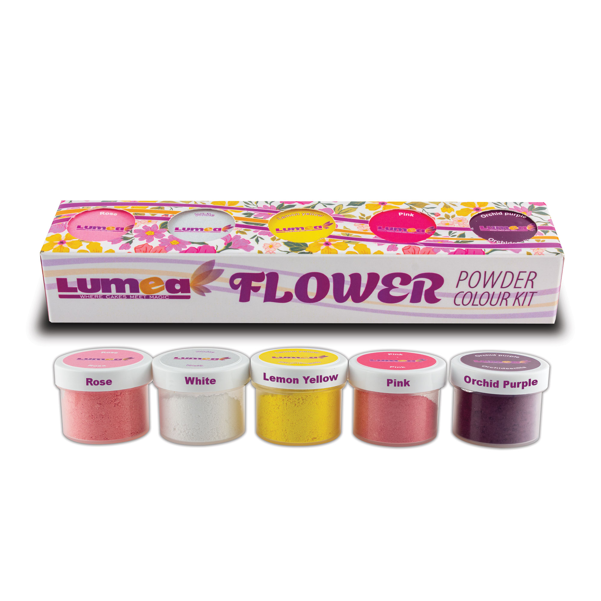 Rose (2.5g), White (2.5g), Lemon Yellow (2.5g), Pink (2.5g), Orchid Purple (2.5g).